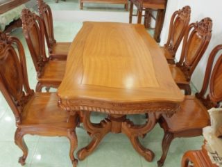 Đầu tiên là mẫu bàn ăn gỗ gõ đỏ nguyên khối siêu dày vô cùng đẳng cấp và đắt đỏ được kết hợp cùng 8 ghế lưng cao đục họa tiết louis hoa hồng vô cùng tinh xảo. Mang lại vẻ đẹp sang trọng cùng sự tiện nghi tối ưu cho mọi không gian phòng bếp.