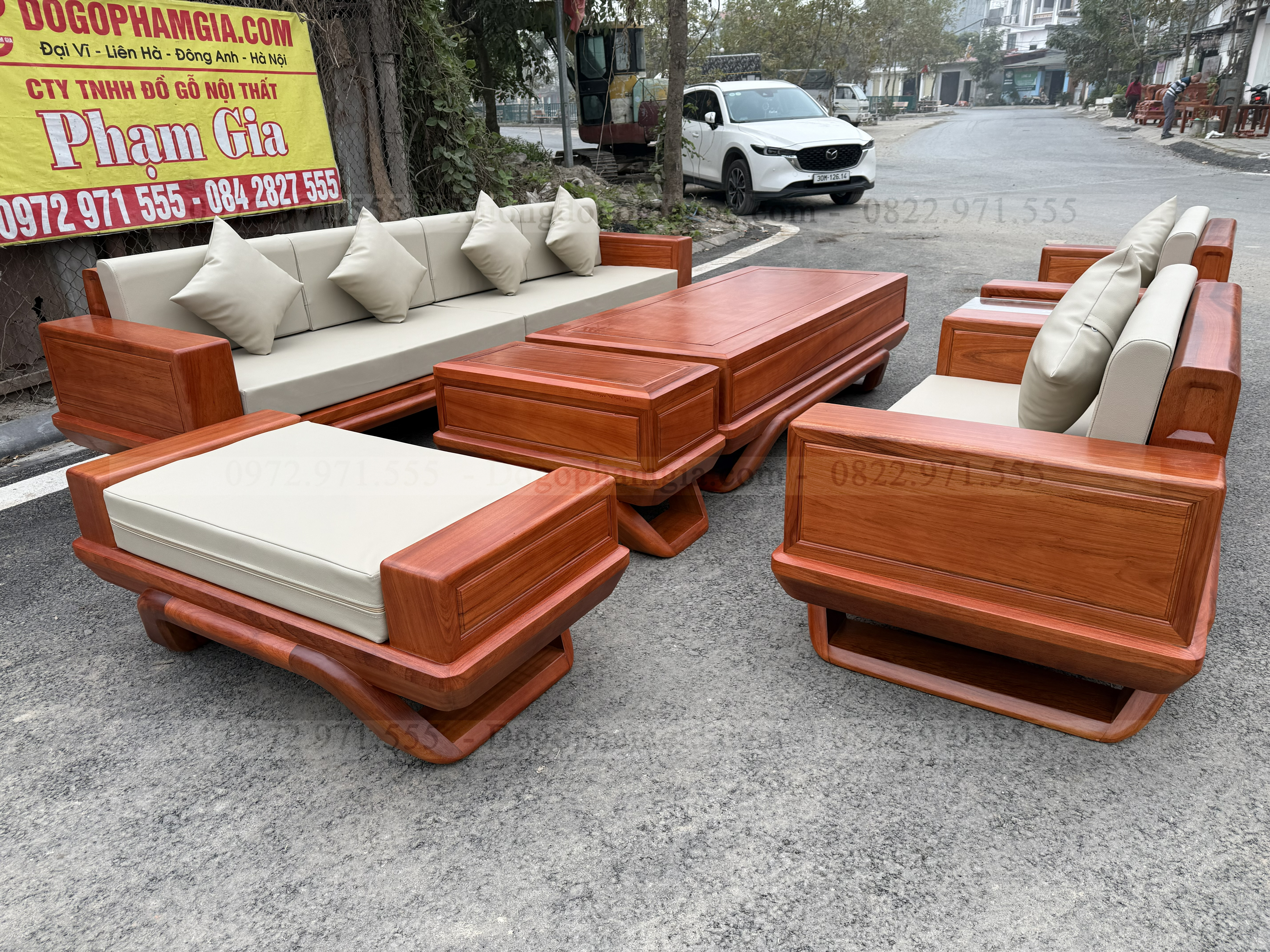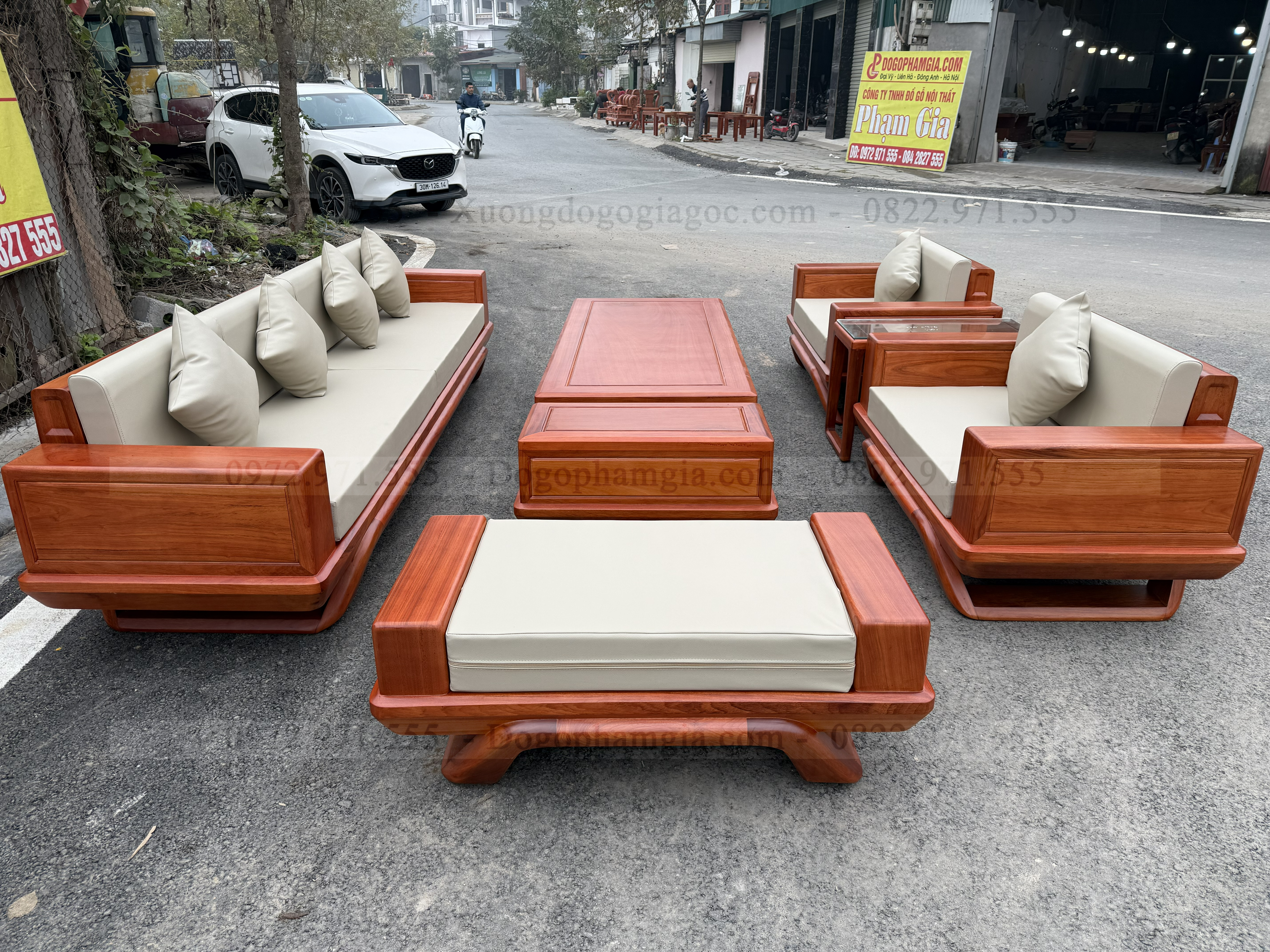 -Chia sẻ từ anh Đức (Nghệ An):“Ban đầu mình chỉ định làm bộ sofa đơn giản thôi, nhưng khi được tư vấn thiết kế theo kiểu chân thuyền thì thấy rất hợp không gian. Nhận hàng xong thực sự hài lòng, gỗ đẹp, form chắc chắn, ngồi rất thoải mái. Nhìn phòng khách sang hẳn lên!”